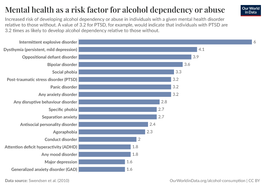 The results in the chart show the increased risk of developing alcohol dependency (we show results for illicit drug dependency in our topic page on drug use) for someone with a given mental health disorder (relative to those without). For example, a value of 3.6 for bipolar disorder indicates that illicit drug dependency became more than three times more likely in individuals with bipolar disorder than those without. The risk of an alcohol use disorder is highest in individuals with intermittent explosive disorder, dysthymia, ODD, bipolar disorder, and social phobia.
