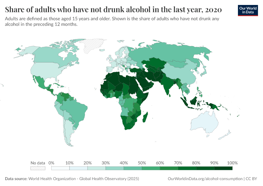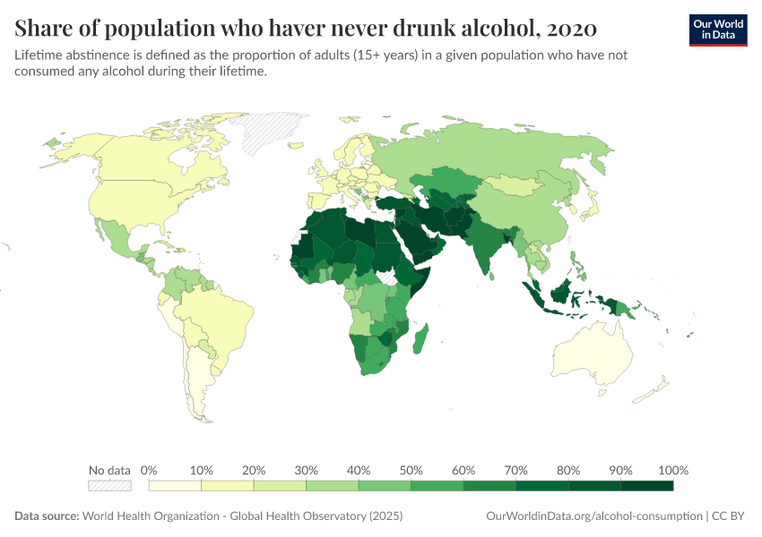 Here, we see particularly high levels of alcohol abstinence across North Africa and the Middle East. In most countries in this region, the majority of adults have never drunk alcohol.