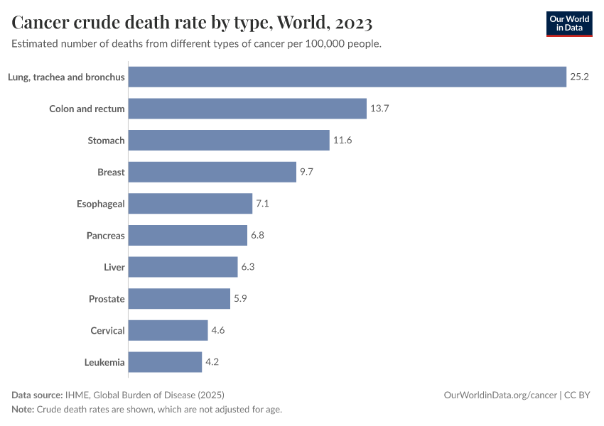 The share of cancer deaths from each type varies between countries. You can explore an interactive chart for different countries showing the relative share of all cancer deaths from each cancer type here: