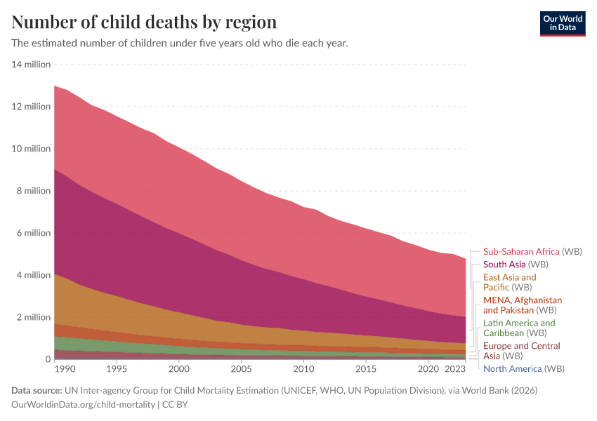 Saloni Dattani, Fiona Spooner, Hannah Ritchie, and Max Roser (2023) - “Child and Infant Mortality” Published online at OurWorldinData.org. Retrieved from: 'https://bespoke-viz-urb.owid.pages.dev/child-mortality' [Online Resource]BibTeX citation
