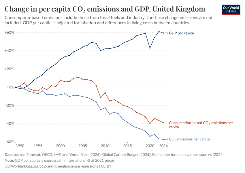 Hannah Ritchie (2021) - “Many countries have decoupled economic growth from CO₂ emissions, even if we take offshored production into account” Published online at OurWorldinData.org. Retrieved from: 'https://bespoke-viz-urb.owid.pages.dev:8789/20260304-094028/co2-gdp-decoupling.html' [Online Resource] (archived on March 4, 2026).BibTeX citation