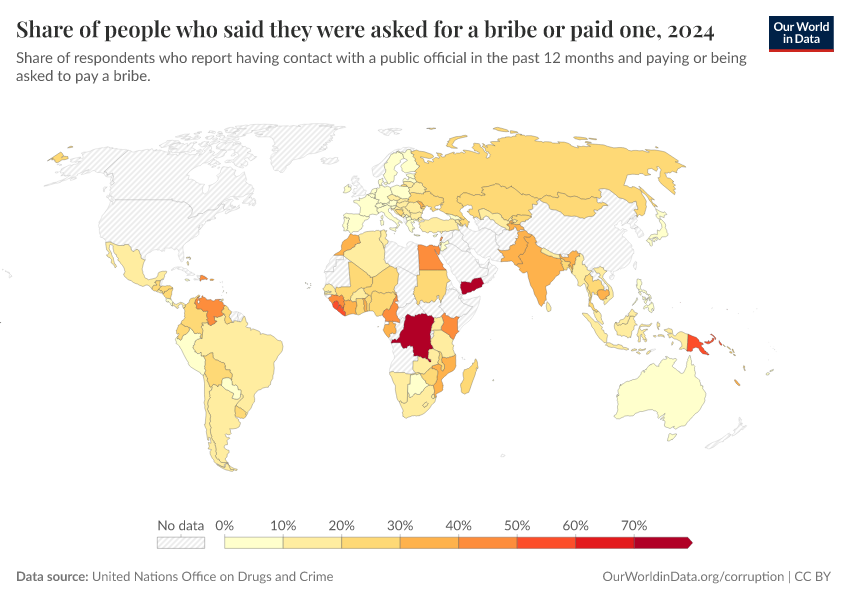 In many other places, however, bribery is far more common. In some countries, more than half of those interacting with public officials report being asked for a bribe or paying one.