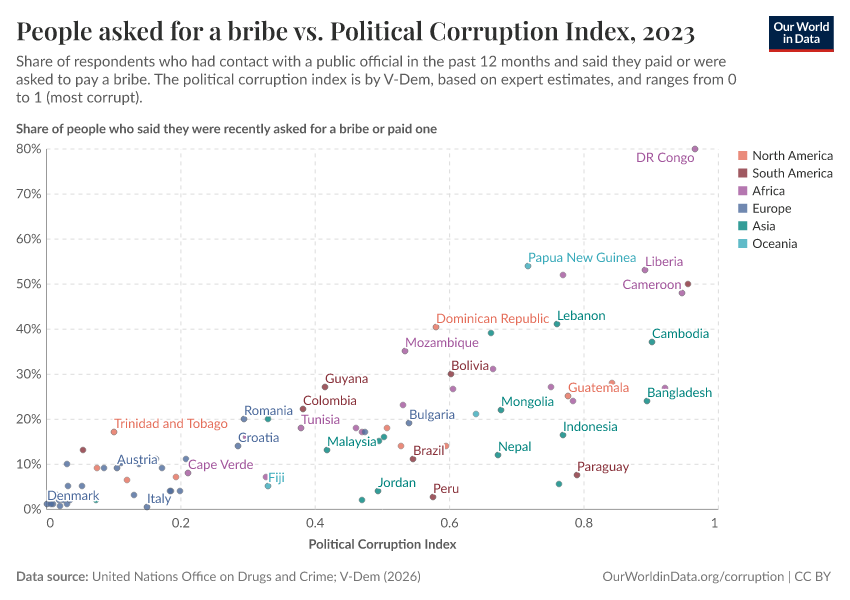 Bastian Herre, Veronika Samborska, and Esteban Ortiz-Ospina (2016) - “Corruption” Published online at OurWorldinData.org. Retrieved from: 'https://bespoke-viz-urb.owid.pages.dev/corruption' [Online Resource]BibTeX citation