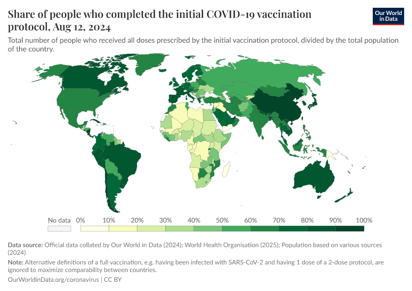 The following chart shows the share of the total population that has completed the initial vaccination protocol.