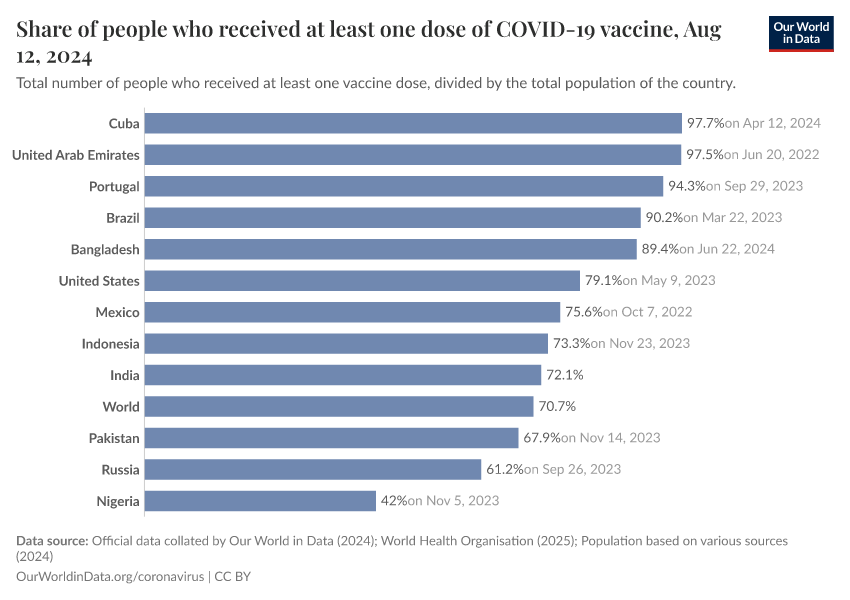 The following charts show the share of the total population that has received at least one dose of vaccine. This may not be equivalent to the share with a complete initial protocol if the vaccine requires two doses.