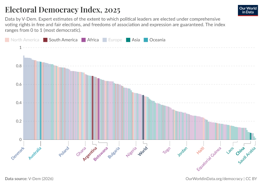 On this page, you can find data, visualizations, and writing on how democracy has spread across countries, how it differs between them, and whether we are moving towards a more democratic world.