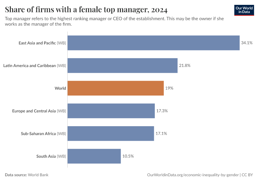 The next chart provides an alternative perspective on the same issue. Here we show the share of firms that have a woman as manager. We highlight world regions by default, but you can remove them and add specific countries.