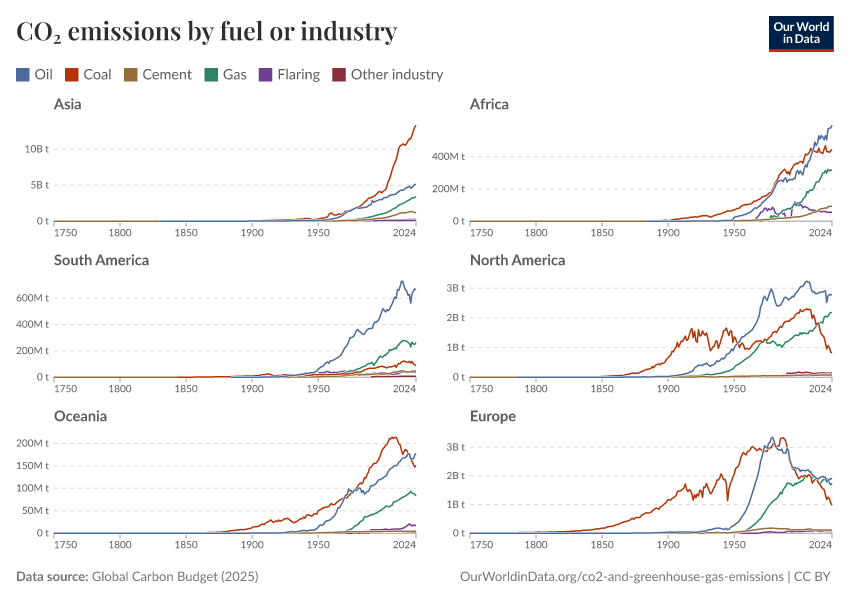 Carbon dioxide emissions associated with energy and industrial production can come from a range of fuel types. The contribution of each of these sources has changed significantly through time and still shows large differences by region. In the chart we see the absolute and relative contribution of CO2 emissions by source, differentiated between coal, gas, oil, flaring, and cement production.