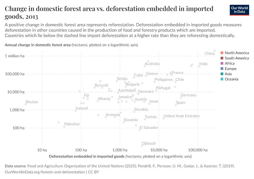 In the chart we see the comparison between the change in domestic forest area, and deforestation driven by imported goods.5 On the vertical axis we have the domestic change in forest area: this is shown only for countries where the forest area is increasing. Since there is often year-to-year variability in deforestation or reforestation rates, this is shown as the five-year average. On the x-axis we have imported deforestation. The grey line marks where the area of domestic regrowth of forests is exactly equal to imported deforestation. Countries that lie along this line would have a net-neutral impact on global forests: the area they are causing to deforestation overseas is exactly as large as the area they are regrowing at home.