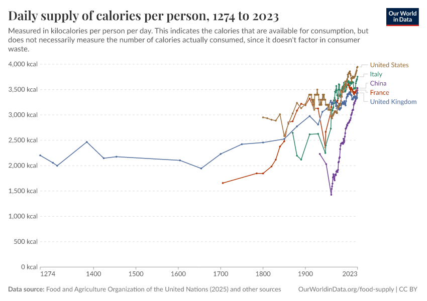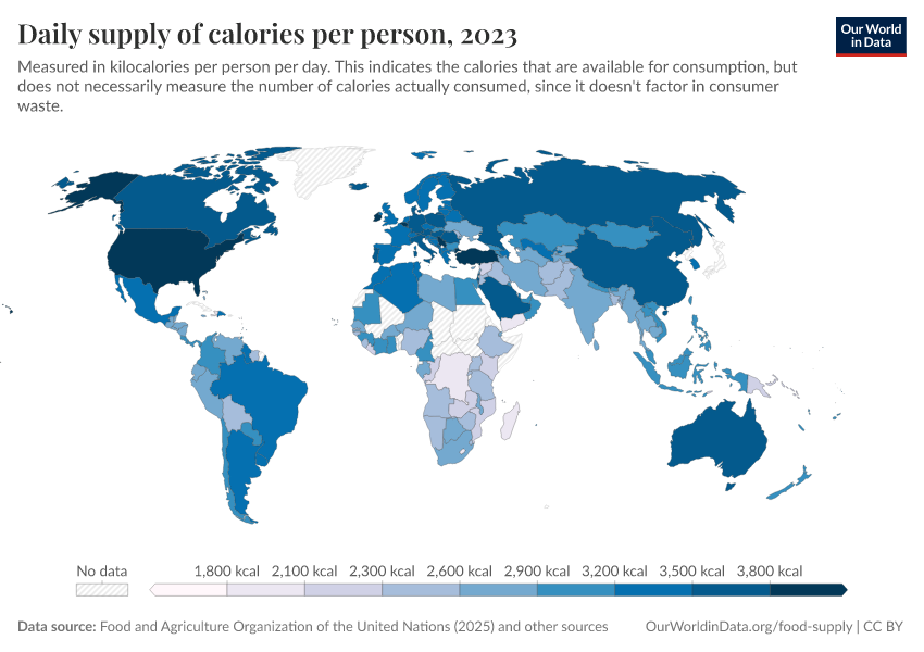 Max Roser, Hannah Ritchie, and Pablo Rosado (2013) - “Food Supply” Published online at OurWorldinData.org. Retrieved from: 'https://bespoke-viz-urb.owid.pages.dev/food-supply' [Online Resource]BibTeX citation