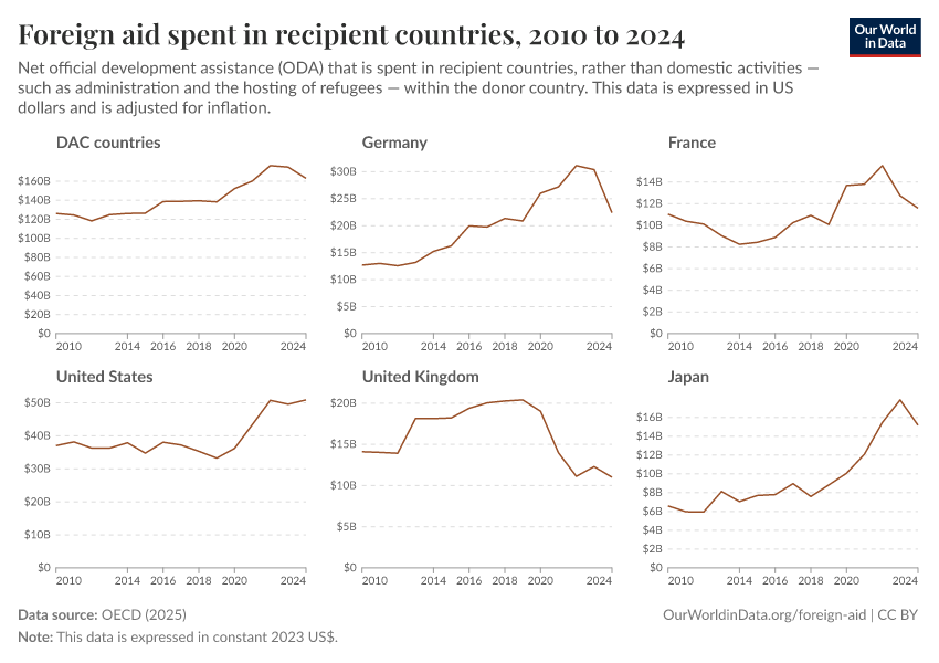 Simon van Teutem, Hannah Ritchie, and Pablo Arriagada (2025) - “How much foreign aid is spent domestically rather than overseas?” Published online at OurWorldinData.org. Retrieved from: 'https://bespoke-viz-urb.owid.pages.dev:8789/20260304-094028/foreign-aid-domestic-overseas.html' [Online Resource] (archived on March 4, 2026).BibTeX citation
