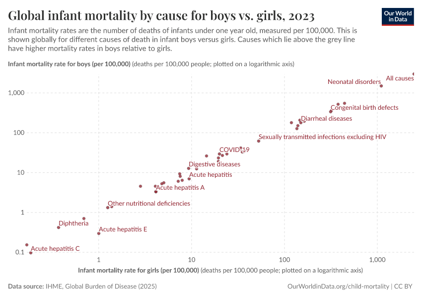 The grey line here represents parity: where countries have the same sex ratio among five-year-olds as the ratio among newborns. As we see, many countries are found slightly above this line, which means the sex ratio for newborns is higher than for 5-year-olds.