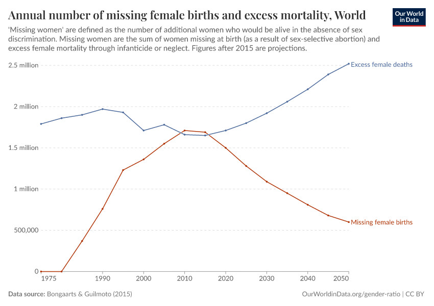 Bongaarts, J., & Guilmoto, C. Z. (2015). How many more missing women? Excess female mortality and prenatal sex selection, 1970–2050. Population and Development Review, 41(2), 241-269.