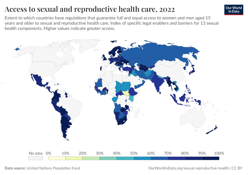 “Data Page: Access to sexual and reproductive health care”. Our World in Data (2026). Data adapted from United Nations Population Fund. Retrieved from https://bespoke-viz-urb.owid.pages.dev:8789/20260304-094028/grapher/access-to-sexual-health-care-and-education.html [online resource] (archived on March 4, 2026).How to cite this data