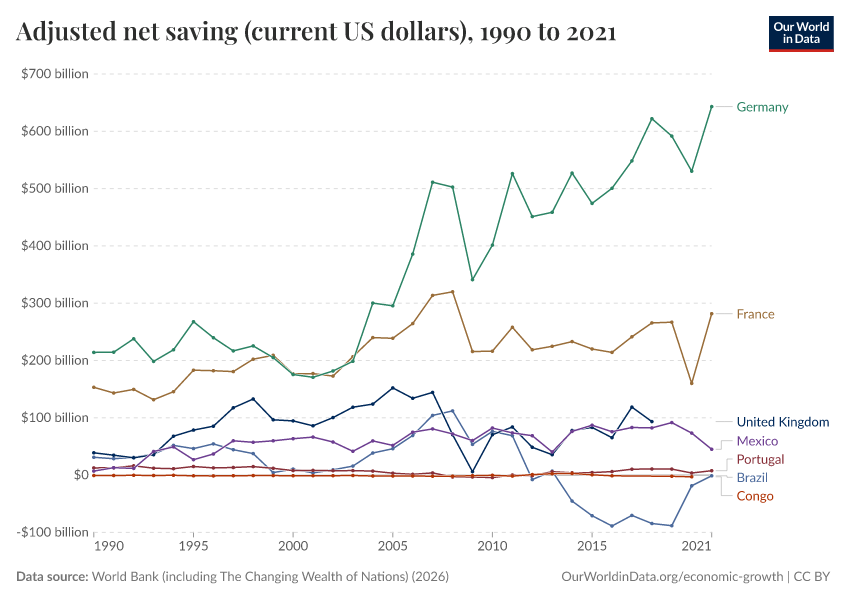 “Data Page: Adjusted net saving (current US dollars)”. Our World in Data (2026). Data adapted from World Bank (including The Changing Wealth of Nations). Retrieved from https://bespoke-viz-urb.owid.pages.dev:8789/20260304-094028/grapher/adjusted-net-saving-current-us-dollars.html [online resource] (archived on March 4, 2026).How to cite this data