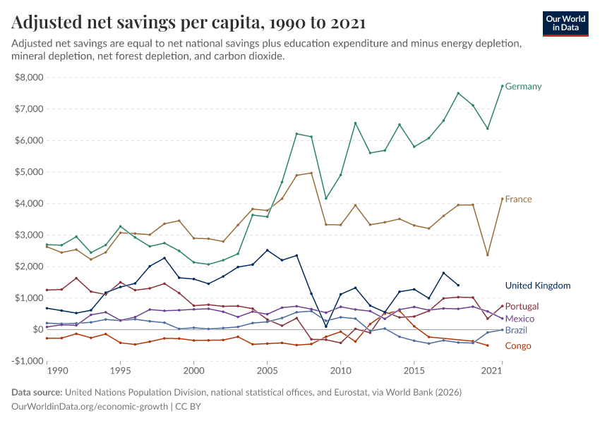 United Nations Population Division, national statistical offices, and Eurostat, via World Bank (2026) – processed by Our World in Data. “Adjusted net savings per capita” [dataset]. United Nations Population Division, national statistical offices, and Eurostat, via World Bank, “World Development Indicators 125” [original data]. Retrieved April 11, 2026 from https://bespoke-viz-urb.owid.pages.dev:8789/20260304-094028/grapher/adjusted-net-savings-per-person.html (archived on March 4, 2026).Download