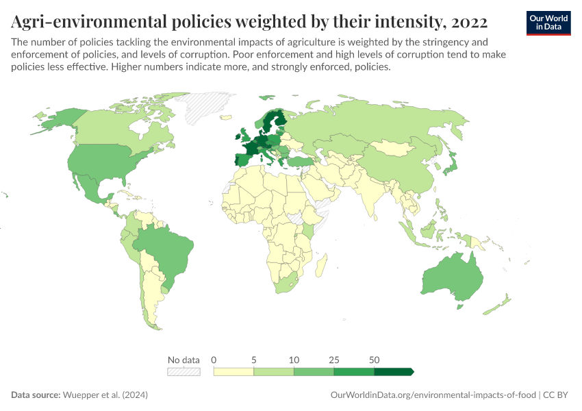 “Data Page: Agri-environmental policies weighted by their intensity”. Our World in Data (2026). Data adapted from Wuepper et al. (2024). Retrieved from https://bespoke-viz-urb.owid.pages.dev:8789/20260304-094028/grapher/agri-environmental-policies-intensity.html [online resource] (archived on March 4, 2026).How to cite this data