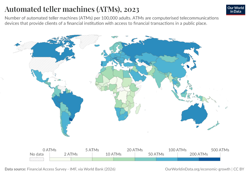 “Data Page: Automated teller machines (ATMs)”. Our World in Data (2026). Data adapted from Financial Access Survey - IMF, via World Bank. Retrieved from https://bespoke-viz-urb.owid.pages.dev:8789/20260304-094028/grapher/automated-teller-machines-atms-per-100000-adults.html [online resource] (archived on March 4, 2026).How to cite this data