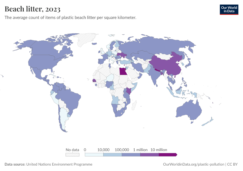 “Data Page: Beach litter”. Our World in Data (2026). Data adapted from United Nations Environment Programme. Retrieved from https://bespoke-viz-urb.owid.pages.dev:8789/20260330-194822/grapher/beach-litter.html [online resource] (archived on March 30, 2026).How to cite this data