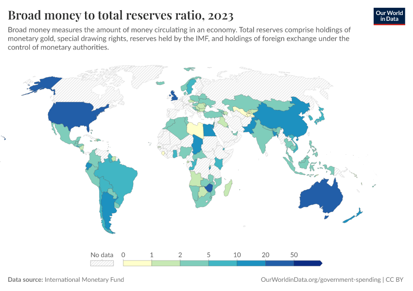 “Data Page: Broad money to total reserves ratio”. Our World in Data (2026). Data adapted from International Monetary Fund. Retrieved from https://bespoke-viz-urb.owid.pages.dev:8789/20260304-094028/grapher/broad-money-to-total-reserves-ratio.html [online resource] (archived on March 4, 2026).How to cite this data