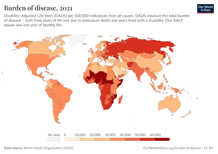 “Data Page: Burden of disease”, part of the following publication: Esteban Ortiz-Ospina and Max Roser (2016) - “Global Health”. Data adapted from World Health Organization. Retrieved from https://bespoke-viz-urb.owid.pages.dev:8789/20260325-171315/grapher/burden-of-disease-who.html [online resource] (archived on March 25, 2026).How to cite this data