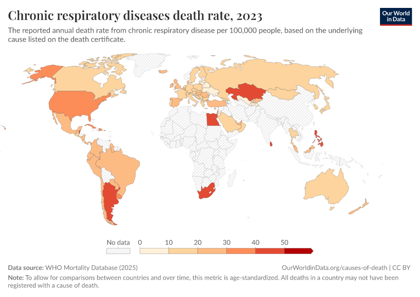 “Data Page: Chronic respiratory diseases death rate”, part of the following publication: Saloni Dattani, Fiona Spooner, Hannah Ritchie, and Max Roser (2023) - “Causes of Death”. Data adapted from WHO Mortality Database. Retrieved from https://bespoke-viz-urb.owid.pages.dev:8789/20260319-180137/grapher/chronic-respiratory-diseases-death-rate-who-mdb.html [online resource] (archived on March 19, 2026).How to cite this data