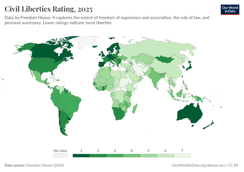 Freedom House (2026) – processed by Our World in Data. “Civil Liberties Rating” [dataset]. Freedom House, “Freedom in the World” [original data]. Retrieved April 11, 2026 from https://bespoke-viz-urb.owid.pages.dev:8789/20260324-083835/grapher/civil-liberties-rating-fh.html (archived on March 24, 2026).Download