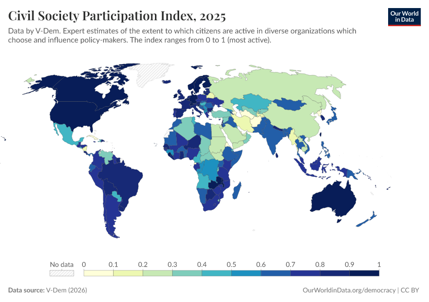 “Data Page: Civil society participation index”, part of the following publication: Bastian Herre, Lucas Rodés-Guirao, and Esteban Ortiz-Ospina (2013) - “Democracy”. Data adapted from V-Dem. Retrieved from https://bespoke-viz-urb.owid.pages.dev:8789/20260325-171315/grapher/civil-society-participation-index.html [online resource] (archived on March 25, 2026).How to cite this data
