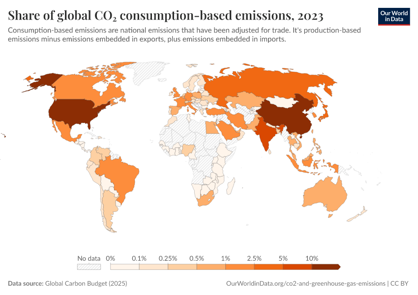 “Data Page: Share of global CO₂ consumption-based emissions”, part of the following publication: Hannah Ritchie, Pablo Rosado, and Max Roser (2023) - “CO₂ and Greenhouse Gas Emissions”. Data adapted from Global Carbon Project. Retrieved from https://bespoke-viz-urb.owid.pages.dev:8789/20260304-094028/grapher/co2-consumption-share.html [online resource] (archived on March 4, 2026).How to cite this data