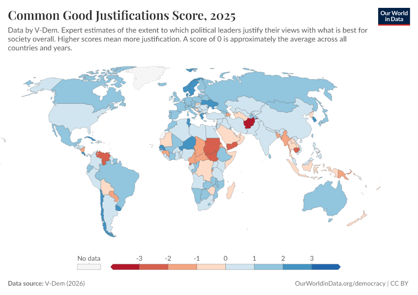 “Data Page: Common good justifications”, part of the following publication: Bastian Herre, Lucas Rodés-Guirao, and Esteban Ortiz-Ospina (2013) - “Democracy”. Data adapted from V-Dem. Retrieved from https://bespoke-viz-urb.owid.pages.dev:8789/20260318-112846/grapher/common-good-justifications-score.html [online resource] (archived on March 18, 2026).How to cite this data