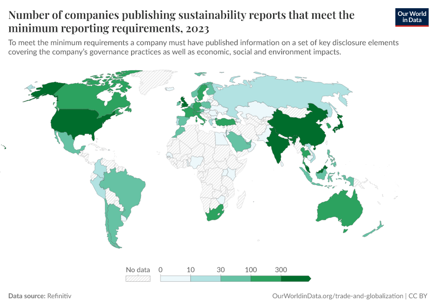 “Data Page: Number of companies publishing sustainability reports that meet the minimum reporting requirements”. Our World in Data (2026). Data adapted from Refinitiv. Retrieved from https://bespoke-viz-urb.owid.pages.dev:8789/20260304-094028/grapher/companies-publishing-sustainability-reports-minimum-requirements.html [online resource] (archived on March 4, 2026).How to cite this data