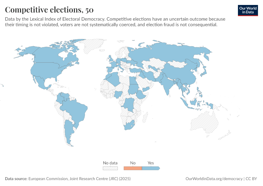 Skaaning et al. (2025) – processed by Our World in Data. “Competitive elections” [dataset]. Skaaning et al., “Lexical Index of Electoral Democracy (LIED) v6.8” [original data]. Retrieved April 11, 2026 from https://bespoke-viz-urb.owid.pages.dev:8789/20260318-102148/grapher/competitive-elections-lexical.html (archived on March 18, 2026).Download