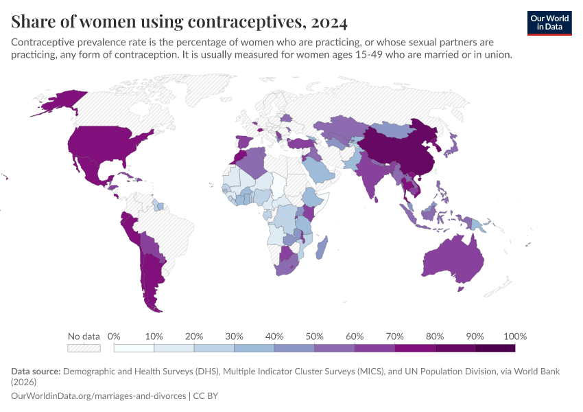 “Data Page: Share of women using contraceptives”. Our World in Data (2026). Data adapted from Demographic and Health Surveys (DHS), Multiple Indicator Cluster Surveys (MICS), and UN Population Division, via World Bank. Retrieved from https://bespoke-viz-urb.owid.pages.dev:8789/20260304-094028/grapher/contraceptive-prevalence-any-methods-of-women-ages-15-49.html [online resource] (archived on March 4, 2026).How to cite this data