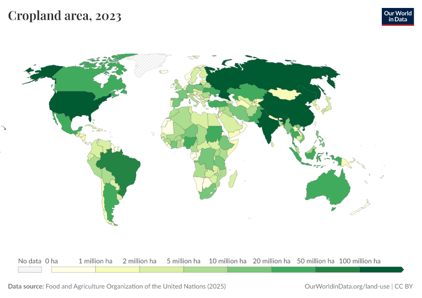 Food and Agriculture Organization of the United Nations (2025) – with major processing by Our World in Data. “Cropland area – UN FAO” [dataset]. Food and Agriculture Organization of the United Nations, “Land, Inputs and Sustainability: Land Use” [original data]. Retrieved April 11, 2026 from https://bespoke-viz-urb.owid.pages.dev:8789/20260304-094028/grapher/cropland-area.html (archived on March 4, 2026).Download