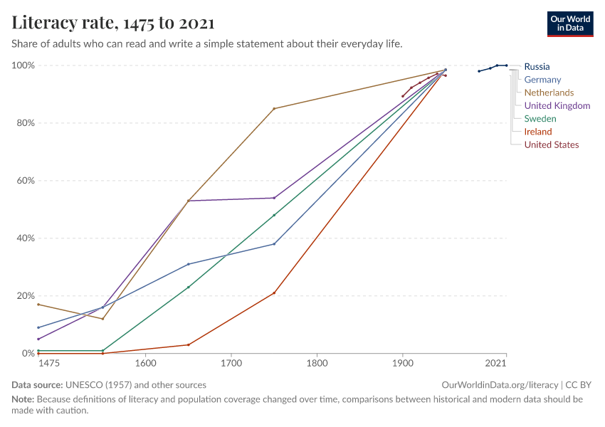 - 1451–1800: Direct literacy surveys did not exist during this period. Data for Great Britain, Ireland, France, Belgium, the Netherlands, Germany, Italy, Spain, Sweden, and Poland comes from the "Charting the Rise of the West" study. The authors estimated literacy rates using manuscript and book production as indirect indicators. While more books likely indicated more readers, this approach has clear limitations.