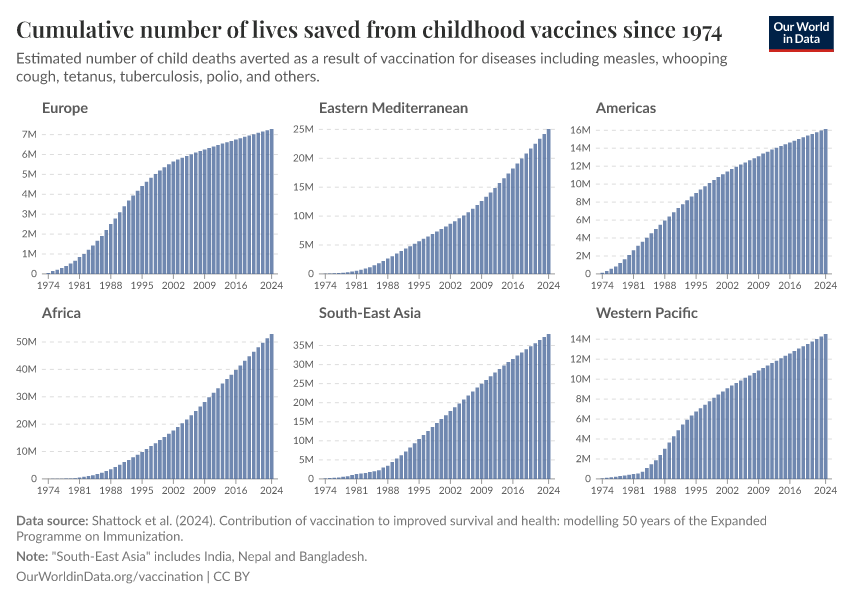 Shattock et al. (2024). Contribution of vaccination to improved survival and health: modelling 50 years of the Expanded Programme on Immunization. – processed by Our World in Data. “Cumulative number of lives saved from childhood vaccines since 1974” [dataset]. Shattock et al. (2024). Contribution of vaccination to improved survival and health: modelling 50 years of the Expanded Programme on Immunization., “cumulative_lives_saved_vaccination_shattock” [original data]. Retrieved April 11, 2026 from https://bespoke-viz-urb.owid.pages.dev:8789/20260304-094028/grapher/cumulative-lives-saved-vaccination.html (archived on March 4, 2026).Download