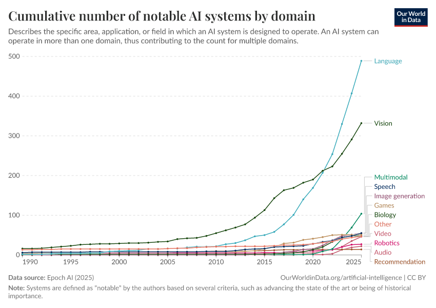 Epoch AI (2025) – with major processing by Our World in Data. “Cumulative number of notable AI systems by domain” [dataset]. Epoch AI, “Parameter, Compute and Data Trends in Machine Learning” [original data]. Retrieved April 11, 2026 from https://bespoke-viz-urb.owid.pages.dev:8789/20260318-110251/grapher/cumulative-number-of-notable-ai-systems-by-domain.html (archived on March 18, 2026).Download