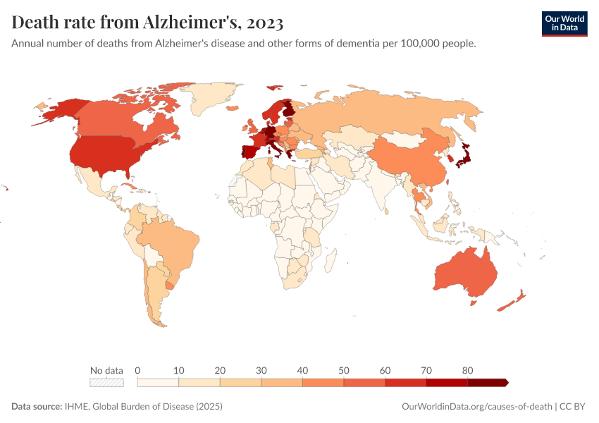 IHME, Global Burden of Disease (2025) – with major processing by Our World in Data. “Death rate from Alzheimer's – IHME” [dataset]. IHME, Global Burden of Disease, “Global Burden of Disease - Deaths” [original data]. Retrieved April 11, 2026 from https://bespoke-viz-urb.owid.pages.dev:8789/20260323-161325/grapher/death-rate-from-alzheimers-other-dementias-gbd.html (archived on March 23, 2026).