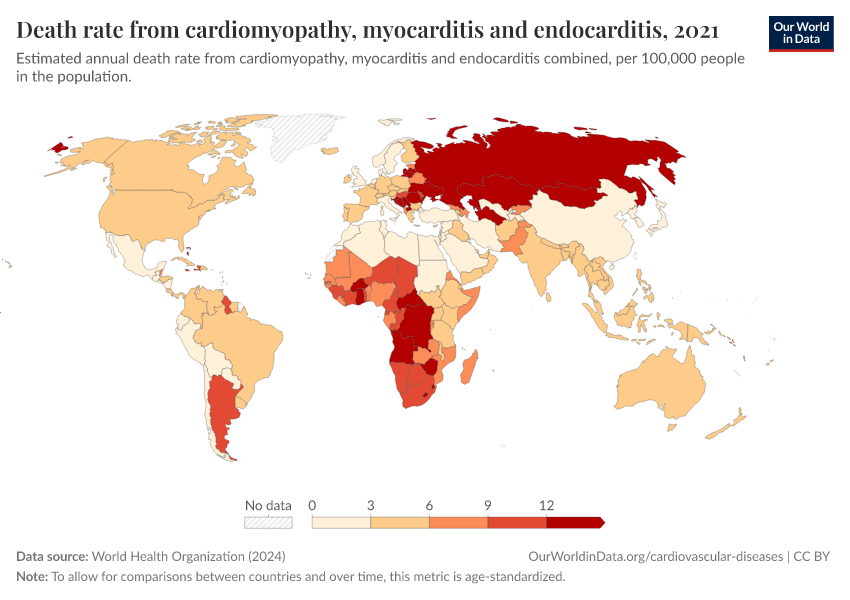 World Health Organization (2024) – with major processing by Our World in Data. “Death rate from cardiomyopathy, myocarditis and endocarditis” [dataset]. World Health Organization, “Global Health Estimates” [original data]. Retrieved April 11, 2026 from https://bespoke-viz-urb.owid.pages.dev:8789/20260325-171315/grapher/death-rate-from-cardiomyopathy-myocarditis-endocarditis-who-ghe-age-standardized.html (archived on March 25, 2026).Download