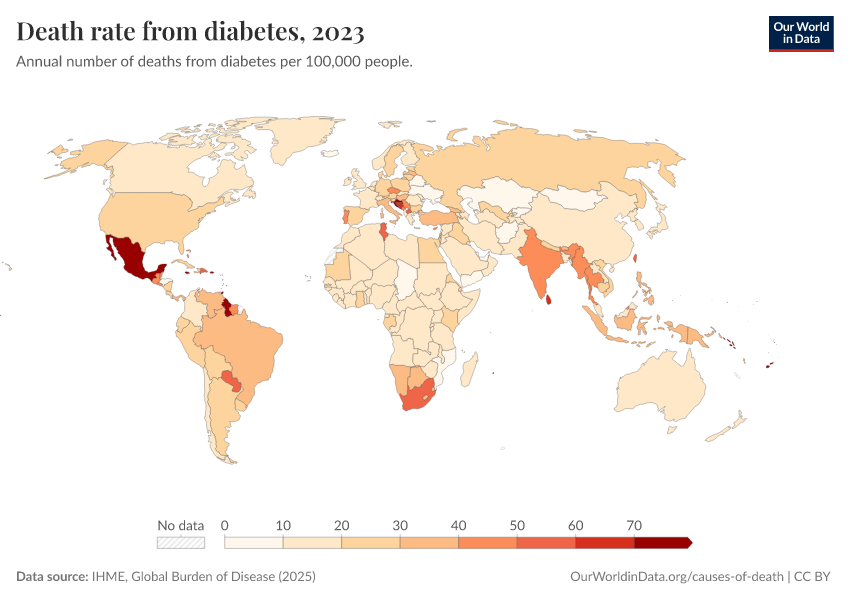 IHME, Global Burden of Disease (2025) – with major processing by Our World in Data. “Death rate from diabetes – IHME” [dataset]. IHME, Global Burden of Disease, “Global Burden of Disease - Deaths” [original data]. Retrieved April 11, 2026 from https://bespoke-viz-urb.owid.pages.dev:8789/20260323-161325/grapher/death-rate-from-diabetes-gbd.html (archived on March 23, 2026).