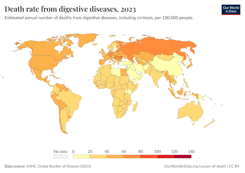 IHME, Global Burden of Disease (2025) – with major processing by Our World in Data. “Death rate from digestive diseases – IHME” [dataset]. IHME, Global Burden of Disease, “Global Burden of Disease - Deaths” [original data]. Retrieved April 11, 2026 from https://bespoke-viz-urb.owid.pages.dev:8789/20260323-161325/grapher/death-rate-from-digestive-diseases-gbd.html (archived on March 23, 2026).