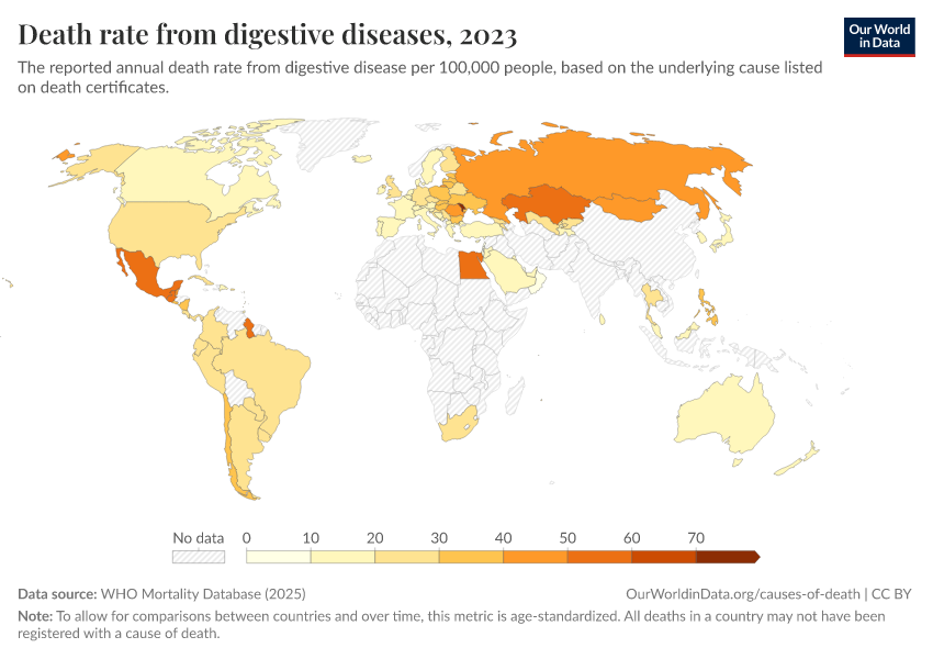 “Data Page: Death rate from digestive diseases”, part of the following publication: Saloni Dattani, Fiona Spooner, Hannah Ritchie, and Max Roser (2023) - “Causes of Death”. Data adapted from WHO Mortality Database. Retrieved from https://bespoke-viz-urb.owid.pages.dev:8789/20260319-180137/grapher/death-rate-from-digestive-diseases-who-mdb.html [online resource] (archived on March 19, 2026).How to cite this data