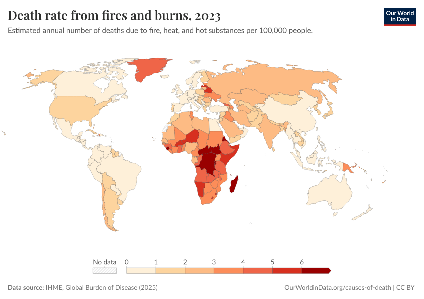 IHME, Global Burden of Disease (2025) – with major processing by Our World in Data. “Death rate from fires and burns – IHME” [dataset]. IHME, Global Burden of Disease, “Global Burden of Disease - Deaths” [original data]. Retrieved April 11, 2026 from https://bespoke-viz-urb.owid.pages.dev:8789/20260323-161325/grapher/death-rate-from-fires-and-burns-ihme.html (archived on March 23, 2026).