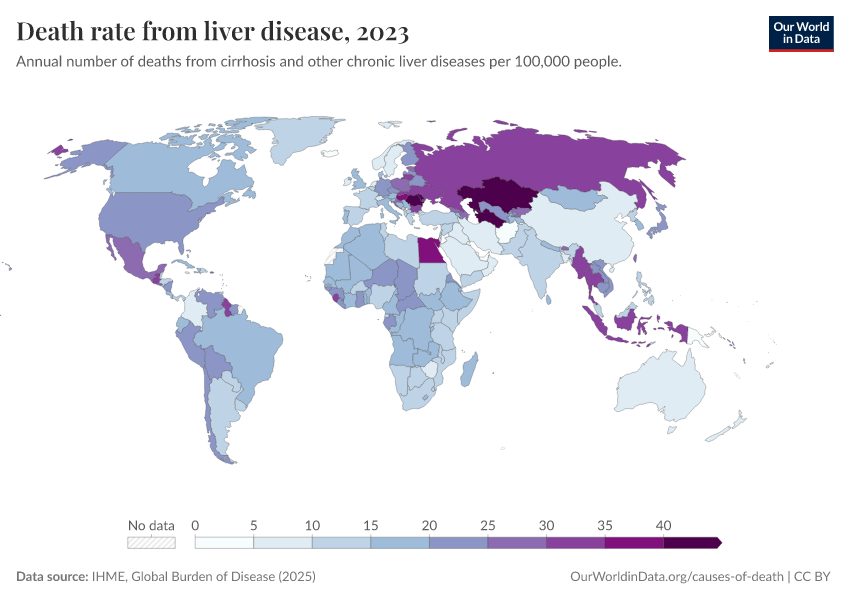 IHME, Global Burden of Disease (2025) – with major processing by Our World in Data. “Death rate from liver disease – IHME” [dataset]. IHME, Global Burden of Disease, “Global Burden of Disease - Deaths” [original data]. Retrieved April 11, 2026 from https://bespoke-viz-urb.owid.pages.dev:8789/20260323-161325/grapher/death-rate-from-liver-disease-gbd.html (archived on March 23, 2026).