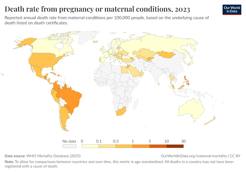 WHO Mortality Database (2025) – with minor processing by Our World in Data. “Death rate from pregnancy or maternal conditions – WHO” [dataset]. WHO Mortality Database, “WHO Mortality Database” [original data]. Retrieved April 11, 2026 from https://bespoke-viz-urb.owid.pages.dev:8789/20260319-180137/grapher/death-rate-from-maternal-disorders.html (archived on March 19, 2026).Download