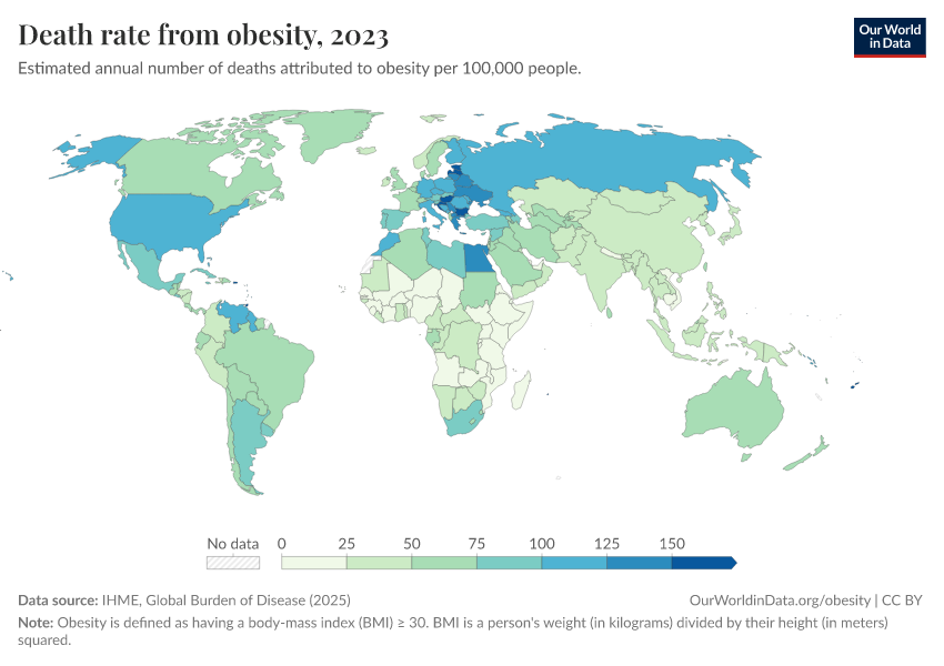 IHME, Global Burden of Disease (2025) – with major processing by Our World in Data. “Death rate from obesity – IHME” [dataset]. IHME, Global Burden of Disease, “Global Burden of Disease - Risk Factors - Deaths” [original data]. Retrieved April 11, 2026 from https://bespoke-viz-urb.owid.pages.dev:8789/20260319-180505/grapher/death-rate-from-obesity-gbd.html (archived on March 19, 2026).