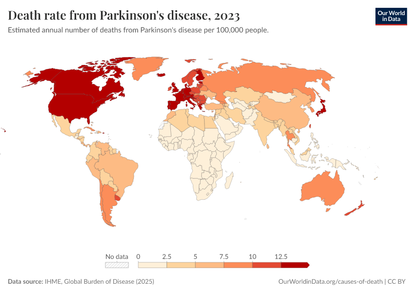 “Data Page: Death rate from Parkinson's disease”, part of the following publication: Esteban Ortiz-Ospina and Max Roser (2016) - “Global Health”. Data adapted from IHME, Global Burden of Disease. Retrieved from https://bespoke-viz-urb.owid.pages.dev:8789/20260323-161325/grapher/death-rate-from-parkinsons-disease-gbd.html [online resource] (archived on March 23, 2026).How to cite this data