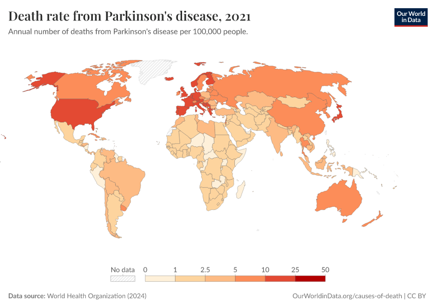 World Health Organization (2024) – with major processing by Our World in Data. “Death rate from Parkinson's disease” [dataset]. World Health Organization, “Global Health Estimates” [original data]. Retrieved April 11, 2026 from https://bespoke-viz-urb.owid.pages.dev:8789/20260325-171315/grapher/death-rate-from-parkinsons-disease-ghe.html (archived on March 25, 2026).Download