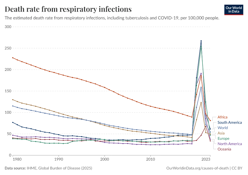 IHME, Global Burden of Disease (2025) – with major processing by Our World in Data. “Death rate from respiratory infections – IHME” [dataset]. IHME, Global Burden of Disease, “Global Burden of Disease - Deaths” [original data]. Retrieved April 11, 2026 from https://bespoke-viz-urb.owid.pages.dev:8789/20260323-161325/grapher/death-rate-from-respiratory-infections-gbd.html (archived on March 23, 2026).