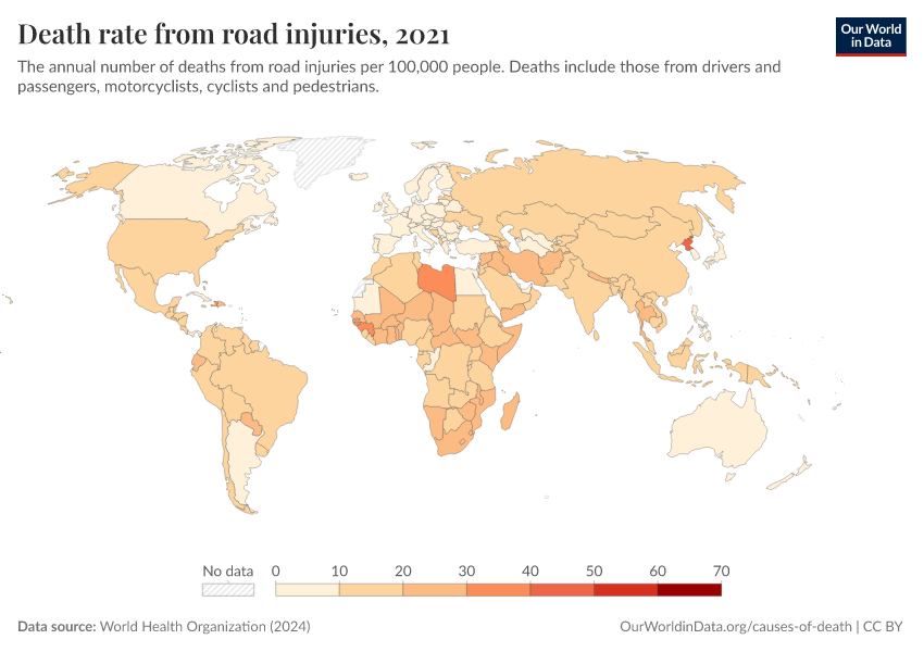 World Health Organization (2024) – with major processing by Our World in Data. “Death rate from road injuries” [dataset]. World Health Organization, “Global Health Estimates” [original data]. Retrieved April 11, 2026 from https://bespoke-viz-urb.owid.pages.dev:8789/20260325-171315/grapher/death-rate-from-road-accidents-ghe.html (archived on March 25, 2026).Download